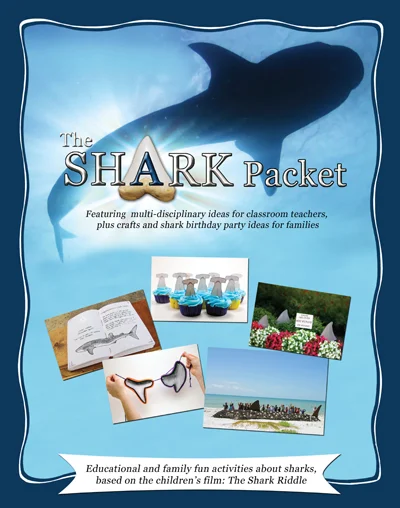 Click on the image above to download the The Shark Packet of family-fun and educational activities based on The Shark Riddle. You'll find 70 pages of ideas for children, including templates for shark hats, shark bookmarks, shark cupcake toppers and a shark tooth banner. You'll find shark tooth scientific inquiry and food chain exploration ideas. Learn about the shapes of shark teeth and find cool shark science examples. How much can a whale shark eat in a day? Find out! Do shark math, play a shark feeding frenzy game, play a basking shark game and play shark bingo. For educators, there are links to curriculum standards. For families, you have many ingredients for a shark birthday party or shark play date!